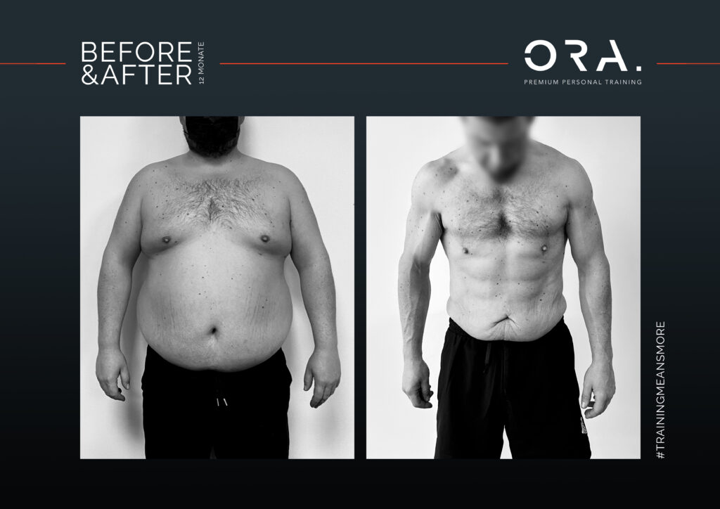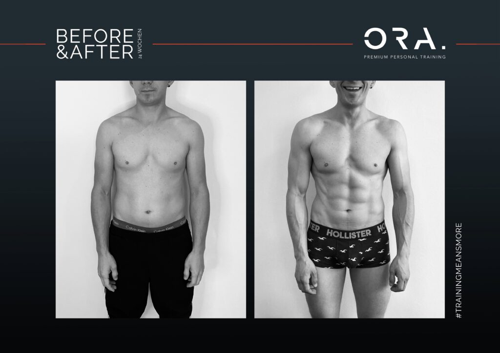 Zu Beginn stand gezielter Muskelaufbau im Fokus. Mit wachsender Muskulatur sank der Körperfettanteil kontinuierlich. In der zweiten Phase wurde die Ernährung umgestellt, um maximale Definition und Fettabbau zu erreichen – ohne Verlust an Körpergewicht.